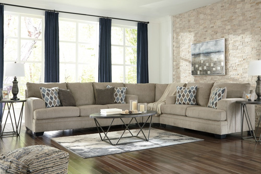 The contemporary Dorsten sectional has comfort written all over it. From the plush cushions to the textured tan fabric, it’s a total winner for relaxation. Designer throw pillows in blue, brown and tan complement the richly neutral upholstery.