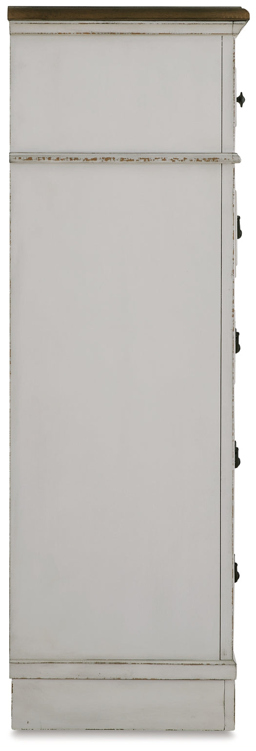 Details Made with hardwood solids, select wood veneer and MDF substrate, Two-tone finish (chipped white and brown wood-tone), Profiled drawer fronts and pilasters, Waist moulding, Metal hardware with dark bronze-tone finish, 5 smooth-gliding drawers with fully finished interiors, dovetail construction and metal ball-bearing side glides (top drawer felt lined), Assembly required