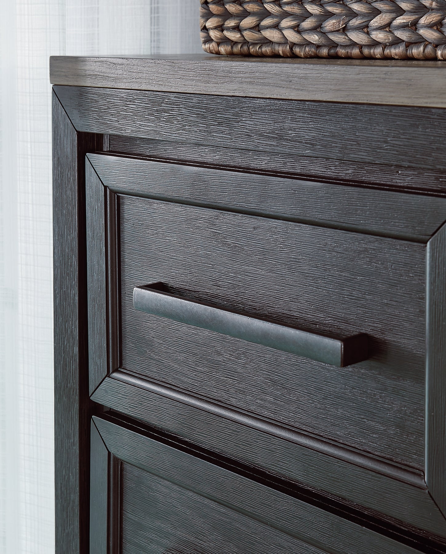 | Details | B989B4: Includes king panel headboard, storage footboard and rails with roll slats, Made with hardwood solids, select oak veneers and engineered wood, Two-tone finish (brushed black and dusty grayish brown wood tone), Headboard with picture frame moulding, Footboard with two deep drawers, Smooth-gliding soft-close drawers with fully finished interiors and dovetail construction, Sleek drawer pulls with black finish, Bed does not require additional foundation/box spring; accommodates most zero clearance adjustable bases with the addition of a bunkie board, Mattress available, sold separately, Assembly required, B989B1: Includes dresser and mirror, Made with hardwood solids, select oak veneers and engineered wood, Two-tone finish (brushed black and dusty grayish brown wood tone), Sleek drawer pulls with black finish, 11 soft-close, smooth-gliding drawers with fully finished interiors and dovetail construction (top drawers felt lined), 5 drawers with brushed black finish; 6 drawers with grayish brown wood tone, 3 drawers located behind each door, Mirror mounts to back of dresser, Assembly required, B989-48: Made with hardwood solids, select oak veneers and engineered wood, Two-tone finish (brushed black and dusty grayish brown wood tone), Sleek drawer pulls with black finish, 5 soft-close, smooth-gliding drawers with fully finished interiors and dovetail construction (top drawers felt lined), 3 pull-out trays (felt lined) and 2 adjustable shelves behind door, B989-92: Made with hardwood solids, select oak veneers and engineered wood, Two-tone finish (brushed black and dusty grayish brown wood tone), Sleek drawer pulls with black finish, 2 soft-close, smooth-gliding drawers with fully finished interiors and dovetail construction, 110V power supply with dual USB charging port, Power cord included; UL listed, | |